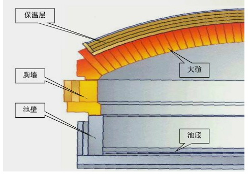 池底保溫:整體性性強的復合保溫結(jié)構(gòu),電熔AZS磚+鋯英石搗打料或電熔剛玉搗打料(耐磨層)+粘土磚(保溫層)+陶瓷纖維板2層30mm厚,錯縫層鋪(絕熱層)。