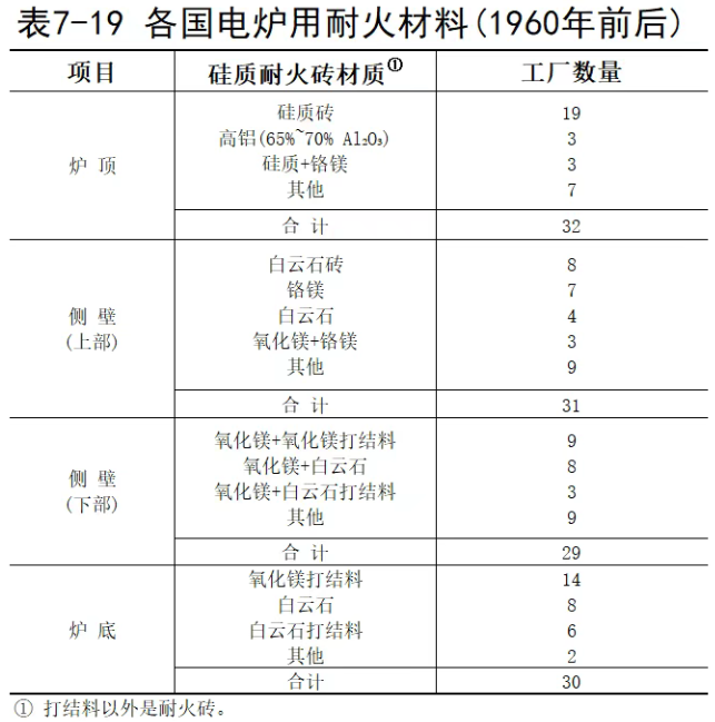 電爐與平爐同樣,電爐的耐火材料也可以分為爐頂、側(cè)壁以及爐底。1960年前后電爐耐火材料的使用狀況,由〇.Porkert對世界8個國家的33家工廠的堿性大型電爐所進(jìn)行的調(diào)查(表7-19)說明了這方面的情況,當(dāng)時日本標(biāo)準(zhǔn)的使用形式是: