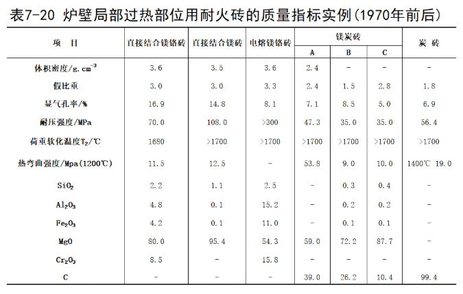 對于局部過熱用的耐火材料,如當(dāng)時期待的“起到煉鋼用耐火材料的試驗廠的作用”那樣,使用了最高性能的耐火材料,試用了磷酸鹽結(jié)合氧化鎂質(zhì),電解鉻鎂質(zhì)等當(dāng)時最高級的耐火磚,緊接著研制1種優(yōu)質(zhì)耐火材料為鎂炭磚,此時為1970年。表7-20所示為當(dāng)時局部過熱部位用耐火磚的質(zhì)量指標(biāo)。