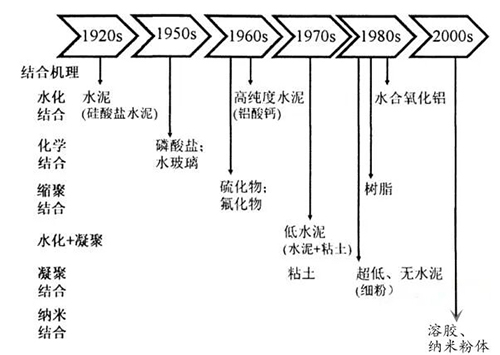 結(jié)合體系的組成和顯微結(jié)構(gòu)決定耐火澆注料性能的優(yōu)劣。耐火澆注料的發(fā)展歷史也屬于結(jié)合劑的發(fā)展史。圖1示出了不定形耐火澆注料由水泥結(jié)合向著低水泥結(jié)合,超低水泥結(jié)合以及無(wú)水泥結(jié)合的方向發(fā)展。